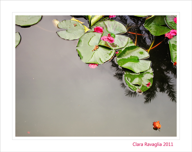 dello specchio d'acqua e i riflessi degli elementi floreali