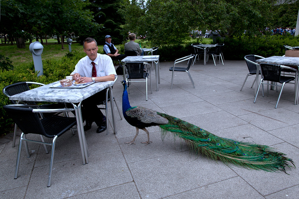 Da una situazione insolita, con quel tocco di surreale, hai saputo tirarne fuori una deliziosa street, immortalando quel confronto di sguardi tra l'uomo e l'uccello..