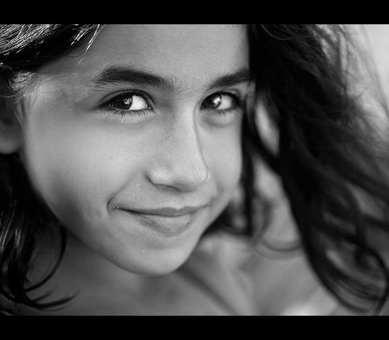 Arriva come un direttissimo l'indole sbarazzina del ritratto, la dolcezza del sorriso che trasmette simpatia. Anche il bianco e nero, pur fortemente dominato dalle tonalità grigie, risualta ben contrastato e piacevole. Un esempio poi lampante di come si possa in certi casi affidarsi, tramite una profondità di campo limitata, ad un fuoco selettivo solo sull'occhio più vicino, senza perdere precisione e bellezza.