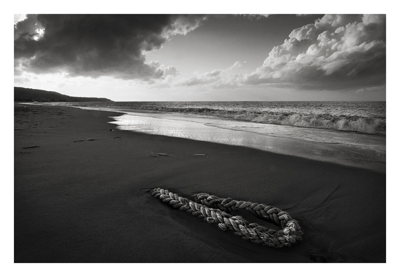La sabbia scura sembra un tessuto che si raggrinza vicino alla corda. Bianco e nero ben fatto, con la parte scura, dell'immagine, in primo piano e la parte luminosa ( che da profondità ) sullo sfondo con il fine di attirare verso di essa lo sguardo dell'osservatore. Se posso...dato che i tre bordi della foto sono scuri anche il quarto, in alto a sx, potevi "vignettarlo"...Complimenti Salvatore, buone foto. Saluti Salvatore.