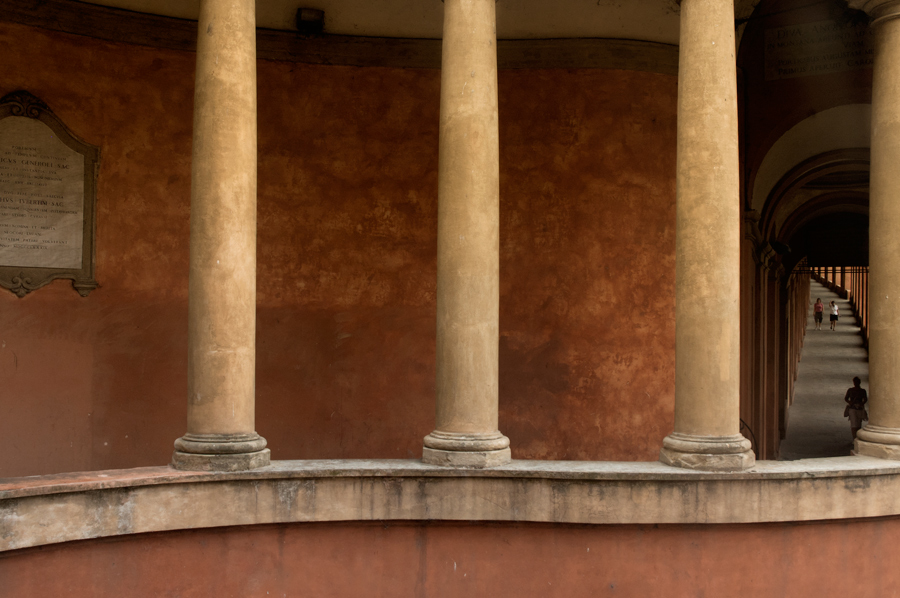 Siamo a Bologna , il portico è quello della Madonna di S. luca, un portico che inizia  dalla cinta dove sorgevano le mura più esterne( sono rimaste solo le Porte)  e dopo un tratto in piano che costeggia le colline per qualche km  in questo punto cambia direzione e pendenza per salire verso la chiesa (colle di S. Luca)