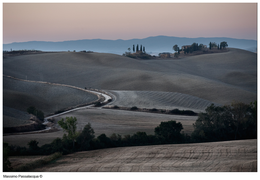 Ciao Massimo, certo che avere la fortuna di trovare questi paesaggi uscendo dalla porta di casa...non capita a tutti, o forse solo ai toscani. L'immagine è bella perchè rappresenta la toscanità del paesaggio così come l'ho assimilata dalla storia dell'arte, è bella perchè la scelta di colorazioni terrigne un po' acide riflette una precisa scelta stilistica e narrativa, oltre che soggettiva rispetto a questo paesaggio. Dell'inquadratura "un dico nulla" perchè è impeccabile.