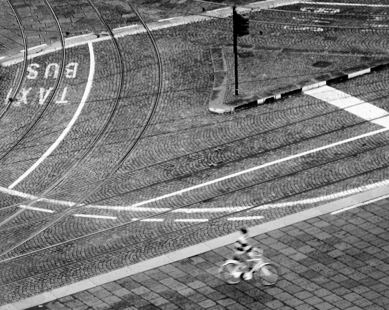 La bicicletta e l'elemento umano tolgono il ruolo di protagonista al gioco di linee, ma non hanno forza sufficiente per diventare l'attore principale. Forse in un altro momento, in un'altra posizione o con un'azione diversa da parte dell'uomo in bici, lo scatto avrebbe acquistato maggiore interesse, chi lo sa... Le possibilità sono sempre infinite. Bisogna cogliere quelle giuste.