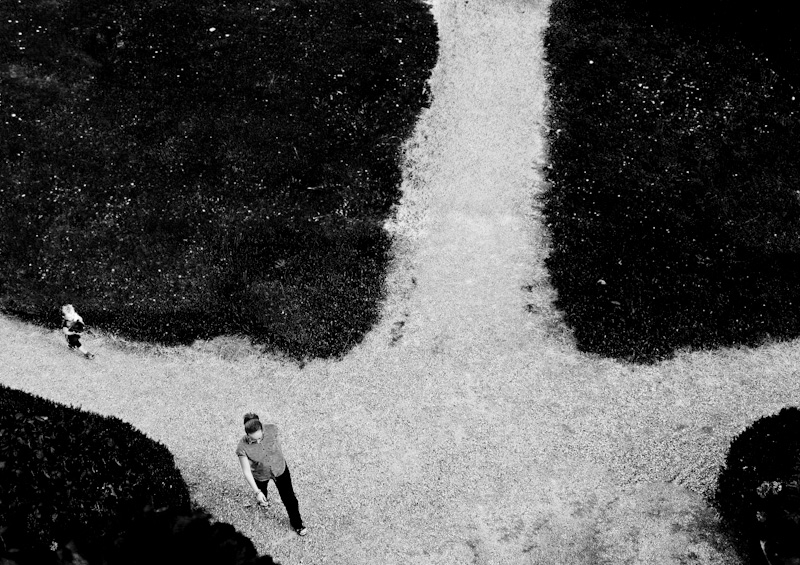 Bella subito! Intrigante poi con una composizione tutta originale..le geometrie delle siepi e del selciato, l'inquadratura dall'alto, e questo semicerchio nell'angolo sinistro disegnato dai due soggetti.... con tonalità bianco e nero che ricordano atmosfere degli anni 60.