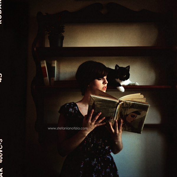 con poca luce, ma con una posa sapientemente studiata, racconti uno spaccato di quotidiano romantico e surreale. Descrivi in un'immagine l'affetto per il tuo animale domestico amato al punto da diventare compagno col quale dividere le tue letture. l'inquadratura centrale in formato quadro rende calma una scena che non ha assolutamente bisogno di essere dinamica, per sua stessa natura. La pellicola che usi è nota per essere contraddistinta da forte contrasto e (lo dice il nome stesso) vividi colori. La lomo a medio formato che usi è nota per la forte caduta di luce ai bordi (correggimi se sbaglio) e da qui la forte vignettatura che comunque concentra la visione della scena laddove serve. Ottima recitazione la tua, ma soprattutto quella della bestiola.