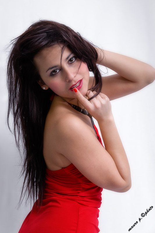 buona la scelta di abito, rossetto e smalto; mi disturba un po' il gomito appena talgiato... ben illiuminato invece il viso!