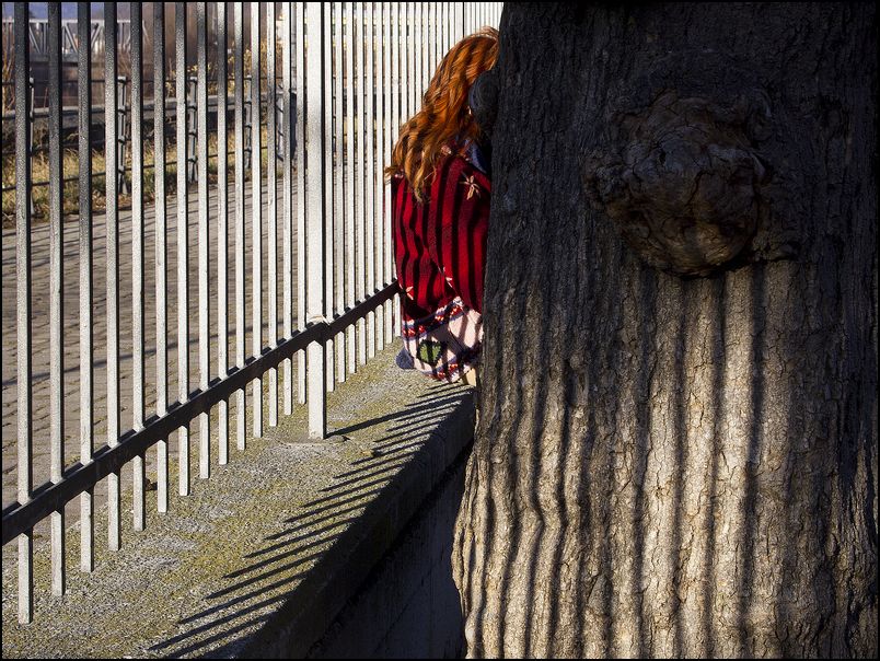 In poco spazio cambia repentinamente il supporto per queste pennellate d'ombra e quindi, oltre all'elemento ringhiera tangibile, vi è pure l'albero fatto a strisce, la donna e la base del muro....