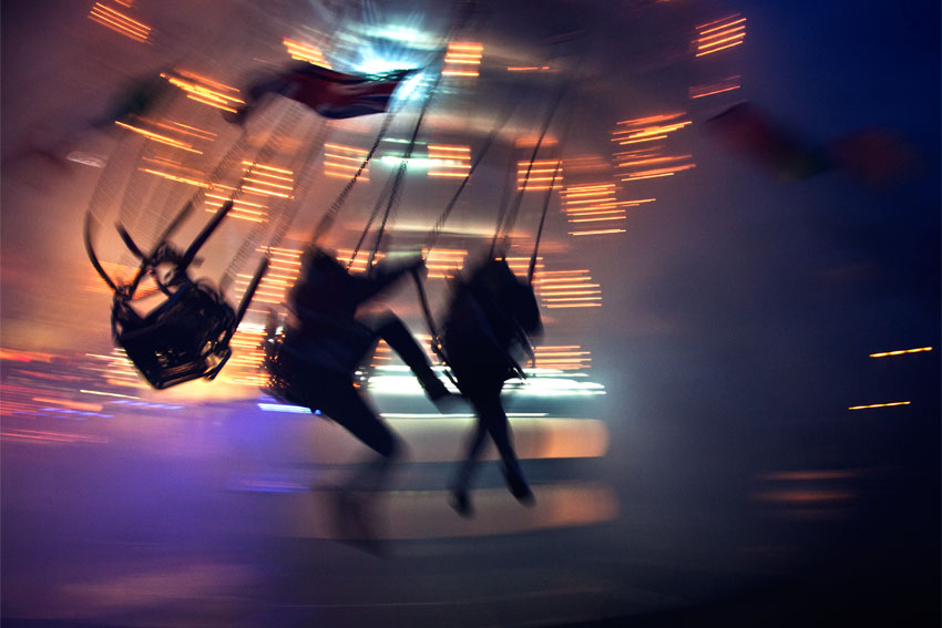 Secondo me lo sfocato dei soggetti rende il tutto molto dinamico e ben si sposa con lo spinning della giostra! I colori sono azzeccatissimi e pure la scelta di tempo di prendere i 3 elementi di primo piano lasciando aria dalla parte giusta!!!!