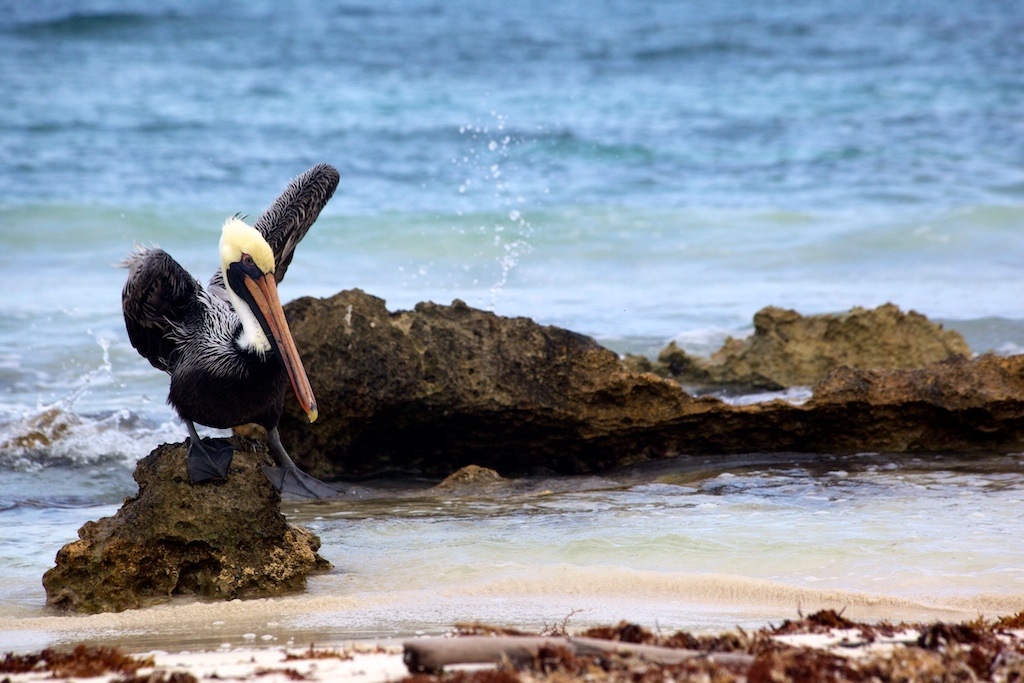 Personalmente, trovo che disturbi un po' il primo piano sfocato.. sembra quasi "sporco". Avrei tagliato "rasospruzzo" sullo sfondo e alla base del masso su cui poggia il pellicano.