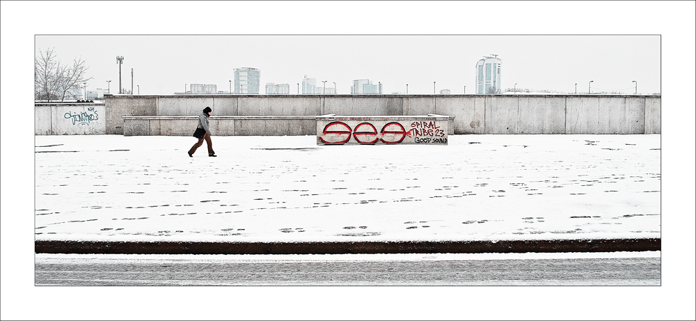 Graficamente ben studiata, cosi come l'organizzazione spaziale che hai scelto: la disposizione del soggetto è perfetta per valorizzare i toni invernali della location.