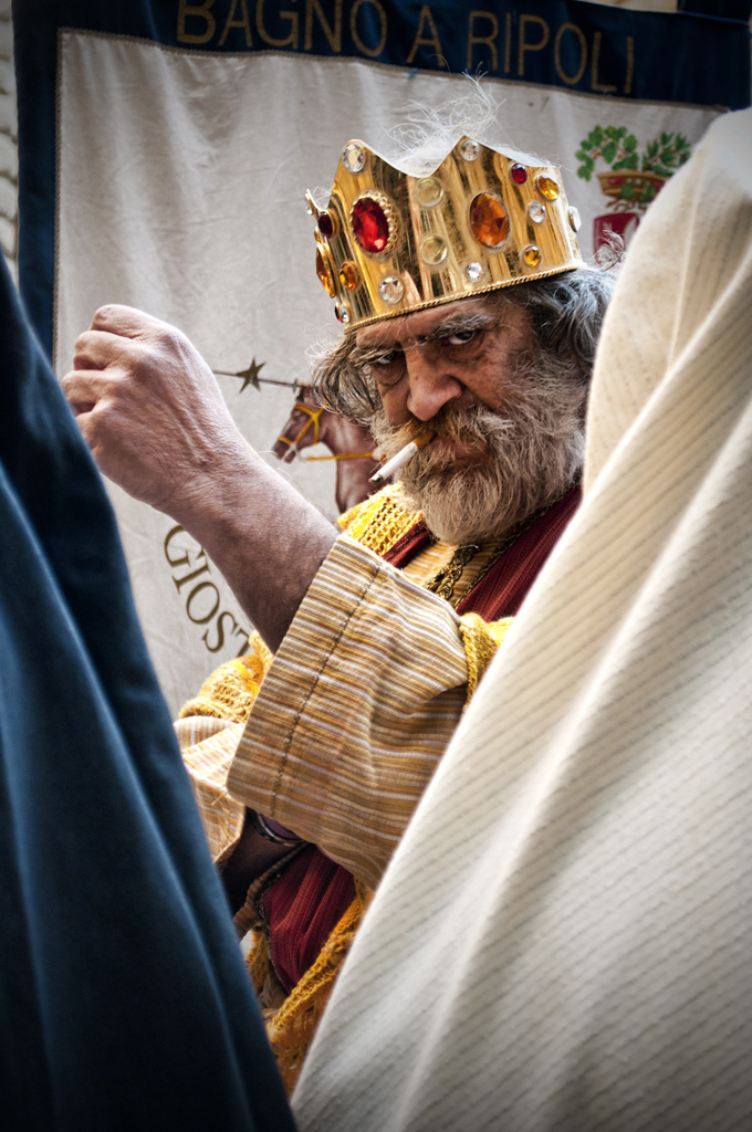 "personaggio" ritratto durante una pausa mentre fuma di nascosto una sigaretta e si mette a posto la manica della pesante tunica.