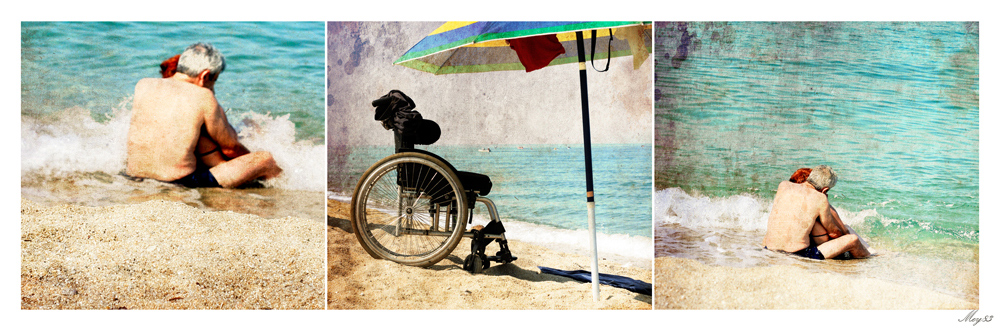 Trovo gradevole anche la resa cromatica e forse, se avessi presentato un'unica foto con ombrellone, carrozzina e bagno, mi sarebbe sembrata banale.