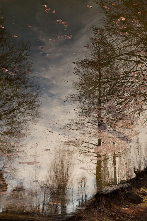 Un paesaggio fiabesco, dove il maestoso svettare degli alberi convive con le delicate increspature dell'acqua e con l'errante galleggiare delle foglie.