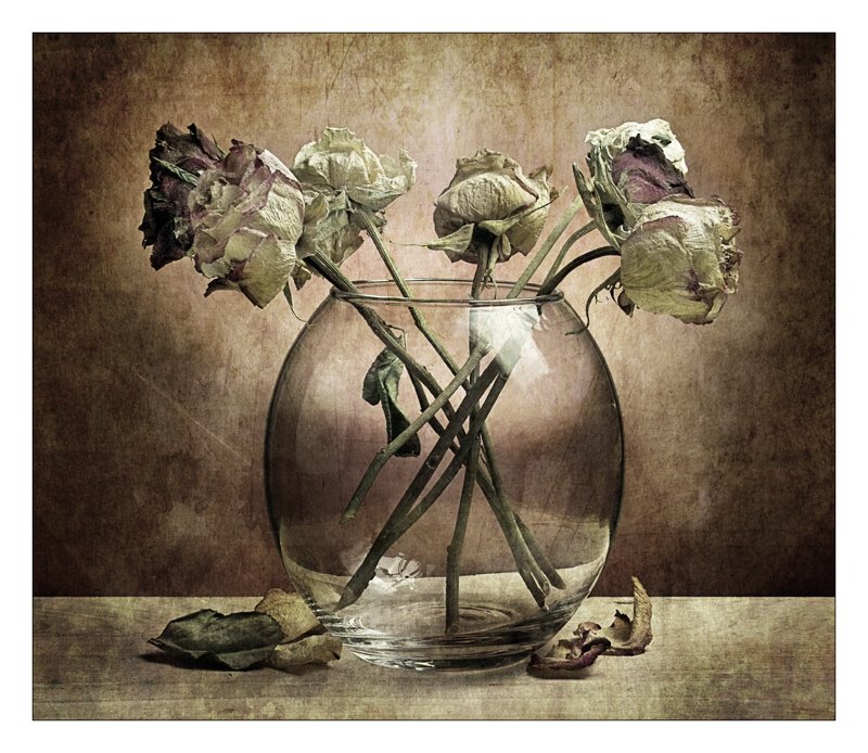 La vignettatura da sfondo e la desaturazione globale rendono ad hoc su di una malinconia già data dall'appassimento dei fiori....