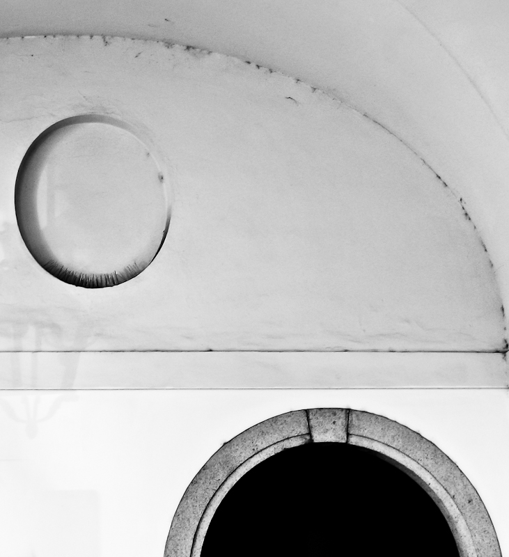 Interessante gioco grafico di rette e curve, pieni e vuoti. Oltre a provare ad ampliare la gamma delle tonalità della parte alta, come già osservato, ed anche a non far apparire il nero della porta così "assoluto", avrei anche lavorato a riportare ad una più regolare circolarità l'incavo rotondo a sinistra (sempre che fosse effettivamente circolare nella realtà, e non ovale come appare). Nel farlo potresti ottenere un formato esattamente quadrato che sarebbe un ulteriore rafforzamento delle geometrie portanti dell'immagine.