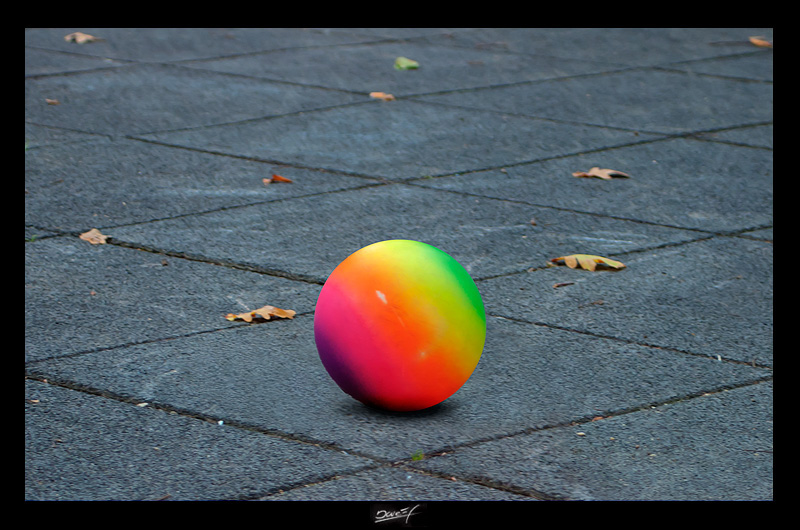 in questo scatto il grigio della pavimentazione è eclissato dai colori della palla e persino dalle minute foglioline a terra..