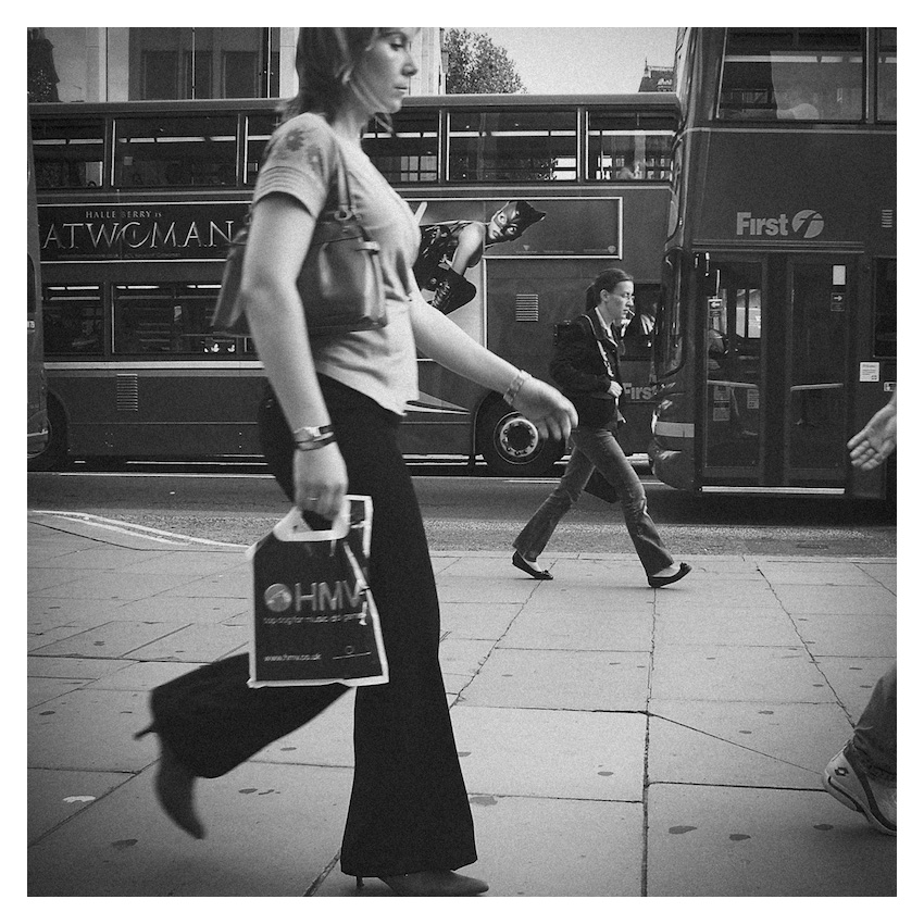Interessanti il piede ma soprattuto la mano che spunta tagliata, quando sembra andare virtualmente a prendere la mano del passante in primo piano. Due pulman forse tre, double bus, da cui ammicca cat woman, che guarda come se la scena fosse ancora più spezzata, da un altra parte in su.