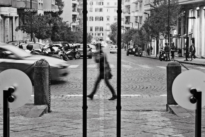 Oltre ad essere una foto compostivamente equilibrata, qui è da premiare il tempismo maniacale con il quale hai incastonato il passante, esattamente al centro della porta ( o quello che sembra una porta!) semiaperta.