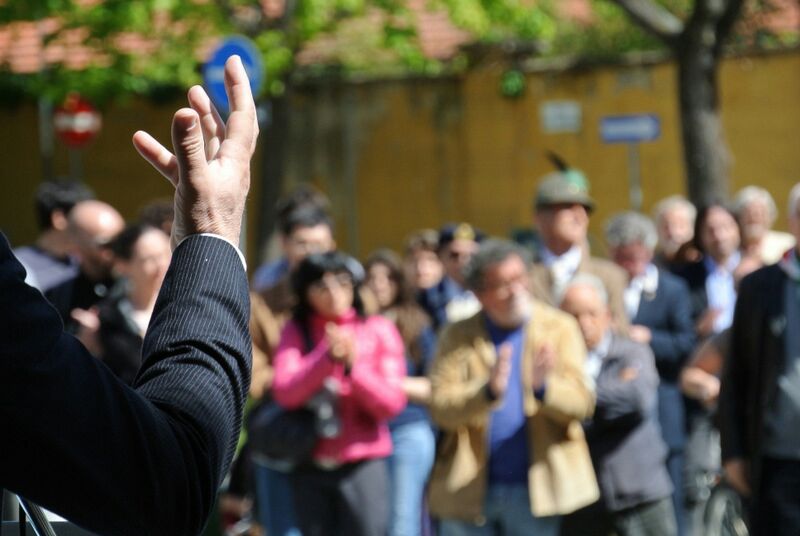 Vedo nella foto una persona che sta parlando alla folla ( presuppongo dal gesto del braccio) però o era poco interessante o la scena non era naturale;