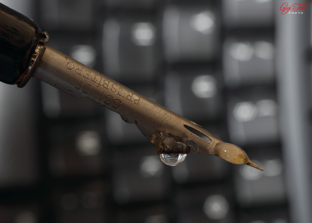 Altrimenti stavo pensando, un foglio stampato con sopra il pennino e una composizione quasi al piano del foglio. Che dici? Ovviamente in questo caso senza goccia!