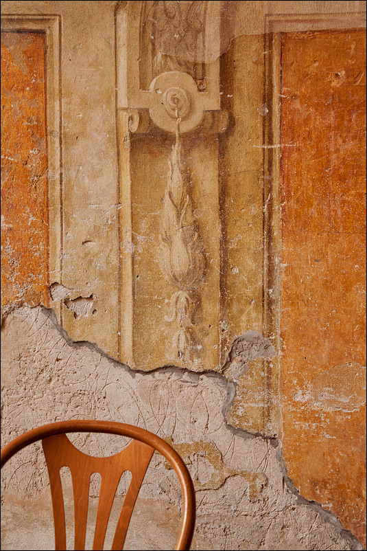 | L'accostamento della manualità, dell'artigianalità, oltre ai toni amalgamati, rende  questo scatto interessante e ben pensato. Il contrasto delle curve sinuose e lavorate della sedia con la verticalità "interrotta" dell'affresco è un altro aspetto molto intrigante. Ottimo.