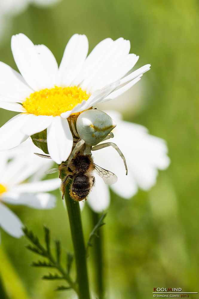 Documentaristica...certo il momento colto ha maggiore importanza...ma conoscendo le abitudini dei Thomisidai, ( se ne fregano di noi e continuano a cacciare e mangiare...), un pannellino avrebbe reso tutto con una luce apprezzabile...ad ogni modo uno scatto che merita di essere visto, bravo.