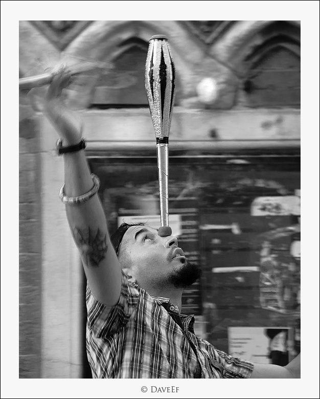 Per quanto riguarda la lettura semantica, ovvero il discorso letterale della tua fotografia a me sembra che il senso ricavato sia: così è la vita: un gioco (richiamato anche dal giocoliere); oppure così è la vita: tenere un birillo sul naso; tutte interpretazioni a mio parere valide perché è esattamente questo che la fotografia rappresenta.