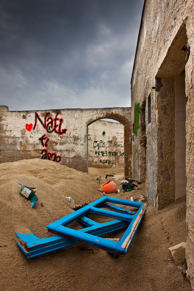 Nella tua foto è colta invece la staticità, l'immobilità del tempo, anche se segnata dalla inevitabile presenza umana, specialmente per la scritta; che però nessun elemento aiuta a determinare quando è stata fatta, (per es se fosse stata visibile una sola frazione di un corpo umano avremmo potuto associare la sua presenza alla scritta...)