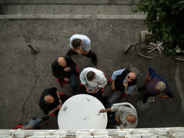 Era da parecchio che non presentavo uno scatto "da balcone". I baldi giovani del circolo sotto casa hanno inaugurato la stagione di briscola all'aperto ( tranquilli, non vi mostrerò tutte le tappe del torneo!...ci credereste:questa è l'unica foto che scattato!).