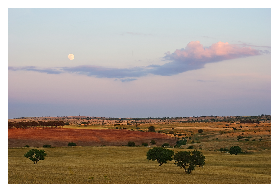Cielo di rara delicatezza, con quella lunaa così vera, lieve , al posto giusto oltre el nuvole. A terra il respiro ampio di un paesaggio aperto, di terra coloratissima e punteggiata d'alberi. Accarezzata appena e solo a tratti da sottili accensioni di luce. Ogni cosa appartiene alla scena e la crea ,come in un piccolo racconto corale.