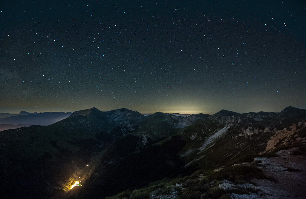 Monti Sibillini - dal Monte della Sibilla le luci del paesino di Foce di Montemonaco poi la valle del Lago di Pilato