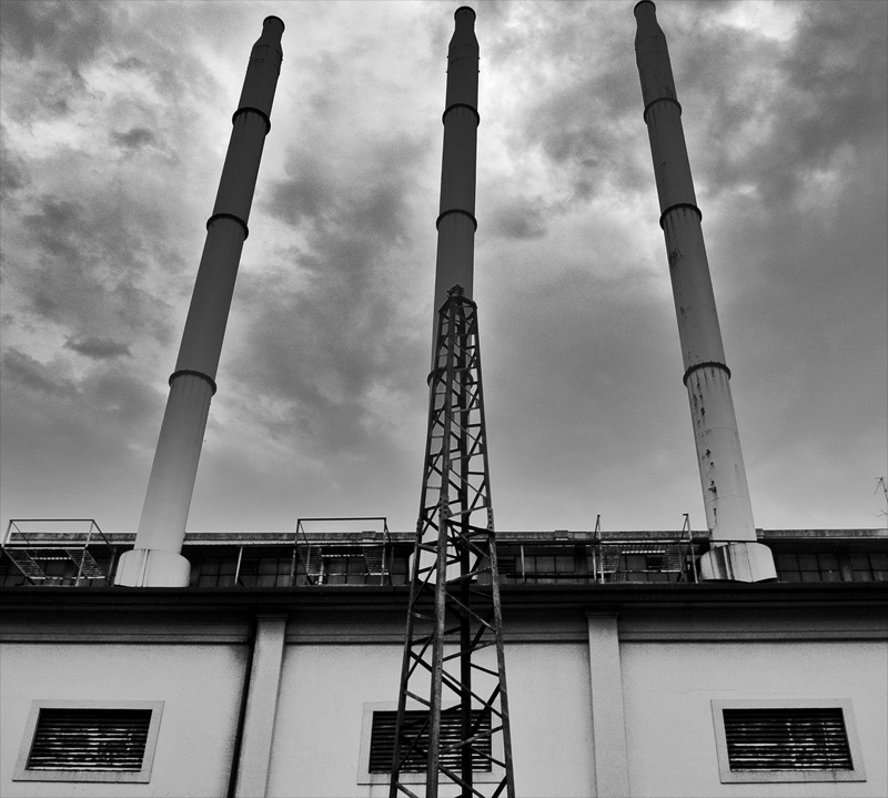 In realtà non mi riferisco tanto alla mancanza di spazio sopra (che pure si avverte, ma, a giudicare dall'originale, ti eri lasciato pochissimo margine già in fase di ripresa), quanto alla mancanza di una simmetria compiutamente realizzata quando invece l'osservatore secondo me è portato ad avvertire che questa era nelle intenzioni dell'Autore. Mi permetto di allegare un esempio di ciò che intendo, nel quale nei limiti del possibile ho provato, partendo dal tuo originale, a correggere le principali linee di inclinazione: queste sono lievi, ma sufficienti a che siano avvertite. Le più influenti sono la verticalità della ciminiera centrale e l'allineamento dei vertici delle tre ciminiere nel senso orizzontale. Il mio punto di vista è che, a meno che non si voglia assegnare un ruolo a questo disequilibrio (cosa che va fatta con grande consapevolezza e sapienza) la percezione di questa mancanza di equilibri si rischia che prenda il sopravvento sulla più importante percezione del senso primario della scena. In questo caso mi disturba più quel qualcosa di "storto" di quanto non riesca ad apprezzare il significato che hai voluto assegnare a quegli slanci verticali, a quella sovrapposizione, a quel cielo drammatizzato ("al volo", e un po' si nota). È soltanto una mia idea (una mania, forse?), che sostengo senza nessuna intenzione di pontificare o proporre rigidi dogmi, anzi, al contrario, la pongo sul tavolo come spunto di riflessione da verificare e sul quale volentieri confrontarmi con idee diverse. La mia impressione è che, nella versione che ho tentato di correggere, l'attenzione vada dritta alla sostanza dell'immagine senza dover fare i conti con un impianto grafico-compositivo da "sistemare". Mi interessa moltissimo conoscere la tua opinione.