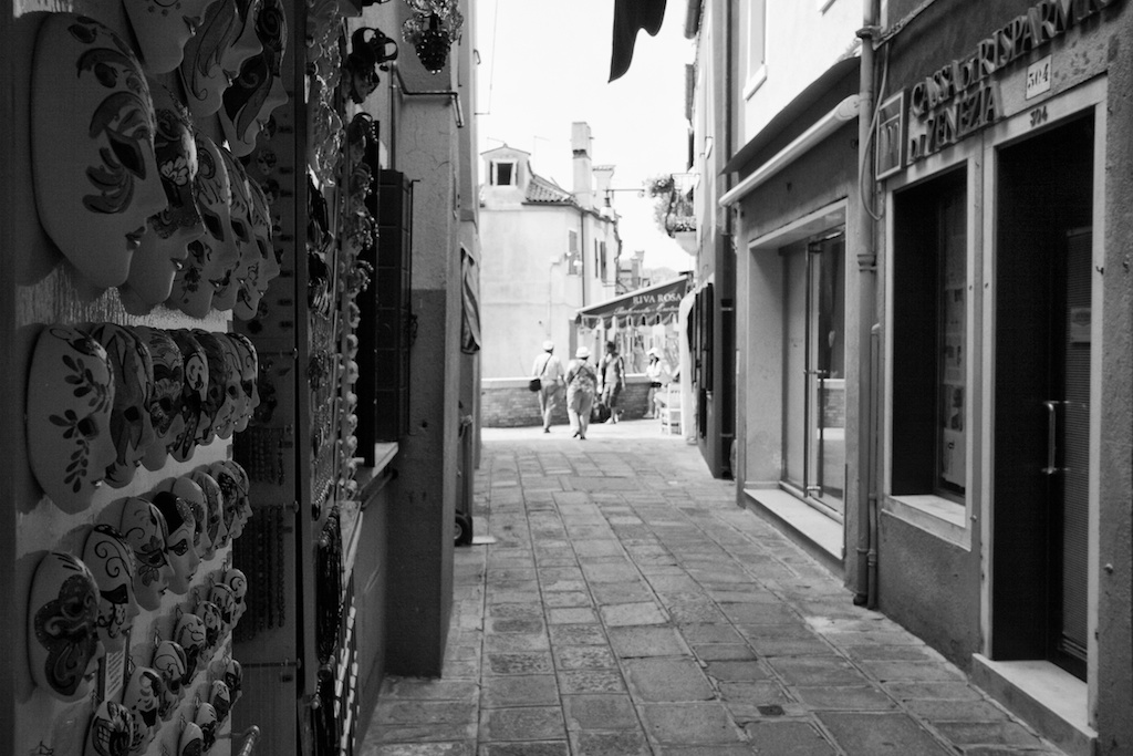 Una foto dove abbondano i grigi e sono completamente assenti i neri. I bianchi, dove ci sono, sono sparati (vedi sfondo). Forse, per rendere leggibili le maschere a sinistra, hai compromesso tuttala gamma tonale della foto. Anche lo scorcio, non è dei più fotogenici, Venezia a mio avviso, offre spunti molto più interessanti. Non volermene, ma devo dire, che vedendo la tua galleria di tutto rispetto, sai fare molto meglio Wink