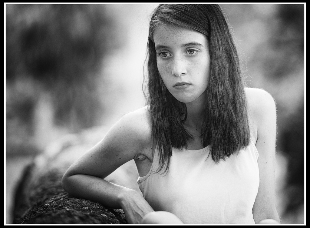 Bellissimo ritratto... Appropriato il bianco e nero. Non mi da alcun fastidio il fatto che tu abbia tagliato le ginocchia perché l'espressione cattura totalmente l'osservatore. Tutto molto bello, sfocato compreso. Bravo!
