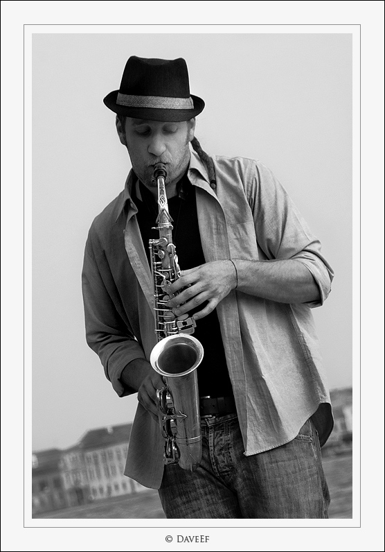 Bel b/n (meglio, a parer mio, della versione colore): sembra di sentirlo suonare questo sax contralto, grazie all'atteggiamento del musicista (merito suo) ma soprattutto grazie a quell'inclinazione complessiva (merito del fotografo) che dà energia alla composizione e rende sinuosa e dinamica la posa del protagonista. (Insomma: l'inclinazione a volta ci sta e ci sta tutta!).