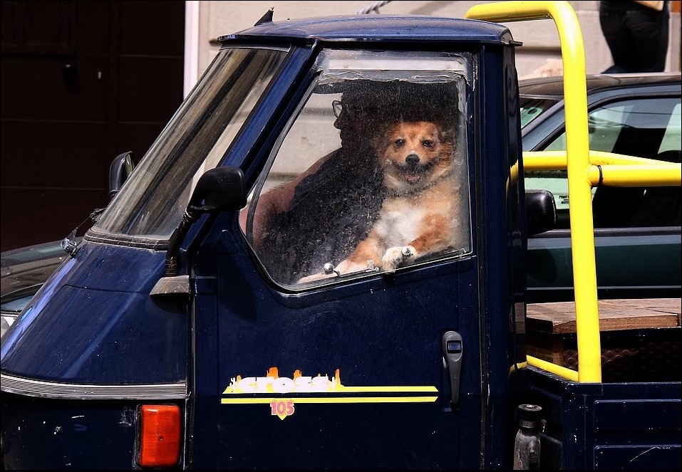 Ha pure la zampetta poggiata sul finestrino come il suo "compagno" di viaggio!
