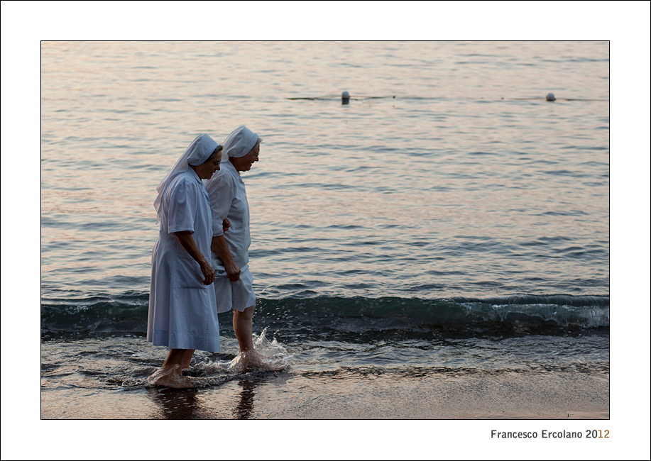 Il camminare insieme, la testa abbassata, i piedi nell'acqua, il particolare momento della giornata... la chicca è la corrispondenza tra le due boe in acqua e le suore.