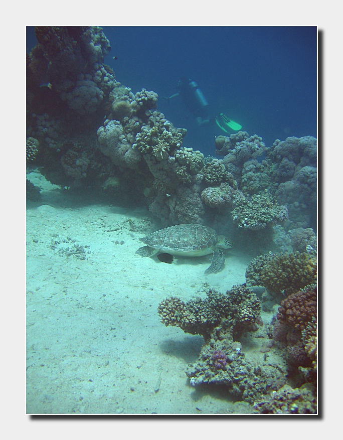 di foto della "modella" ne ho svariate... dai primi piani a ritratti ambientati ... ma intanto che mi immergevo nuovamente per l'ennesima foto, ho visto il sub che le passava accanto senza nemmeno notarla. Mi è scappato da ridere, ed ho scattato proprio perchè mi sembrava che la tartaruga stesse giocando a nascondino con un gruppetto di sub che le sfilava accanto.