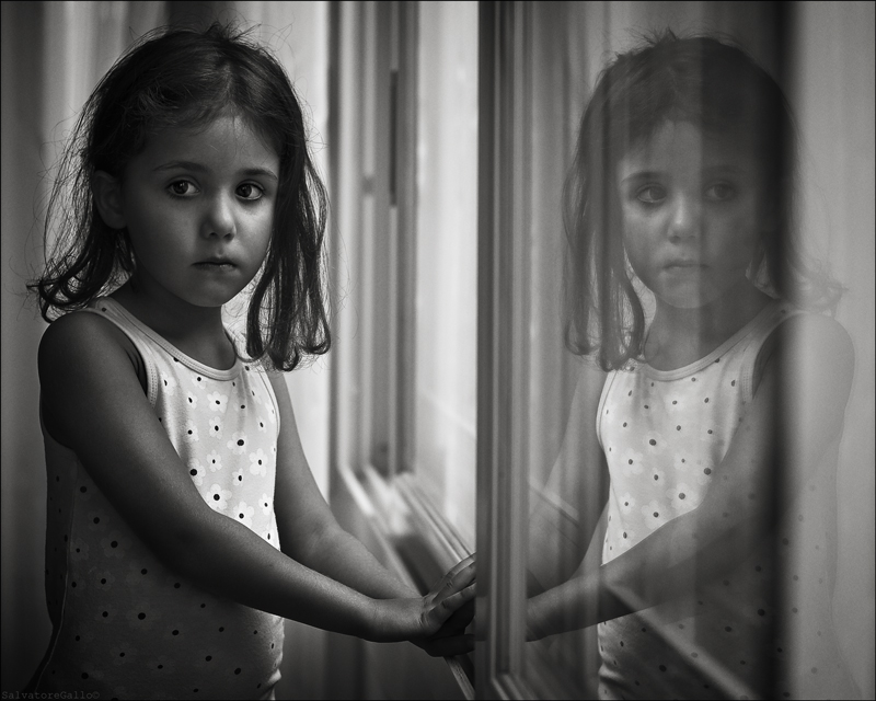 In realtà Ilaria è in posa, nel senso che l'ho guidata io in quella precisa zona della casa dove ci sono questi finestroni che mi avevano precedentemente ispirato questa fotografia. Era infatti qualche giorno che stavo appresso alla luce che filtra da queste ante vetrate scorrevoli. Mi piaceva l'idea che sia lei che il suo riflesso guardassero all'estremità del fotogramma. Una volta che ha raggiunto una posizione che mi sembrasse soddisfacente dal punto di vista dell'illuminazione ho solo atteso il momento che ho ritenuto opportuno per scattare. Nel frattempo abbiamo chiacchierato un po'