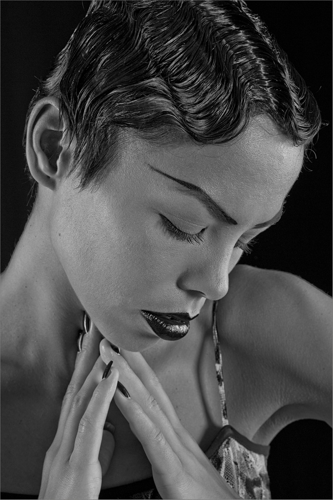 Mi piace molto il taglio e la posa di lei, entrambi inconsueti, l'unica cosa che a me distrae nell'immagine è il trucco delle sopracciglia che non si fonde con il sopracciglio dx ma rimane isolato.. ma è una piccolezza in una gran bella foto..