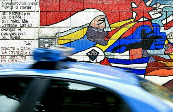 interessante, perché il viso e le braccia levate del murales portano il contenuto delle parole scritte sul muro verso la direzione opposta della volante ripresa nel mosso.