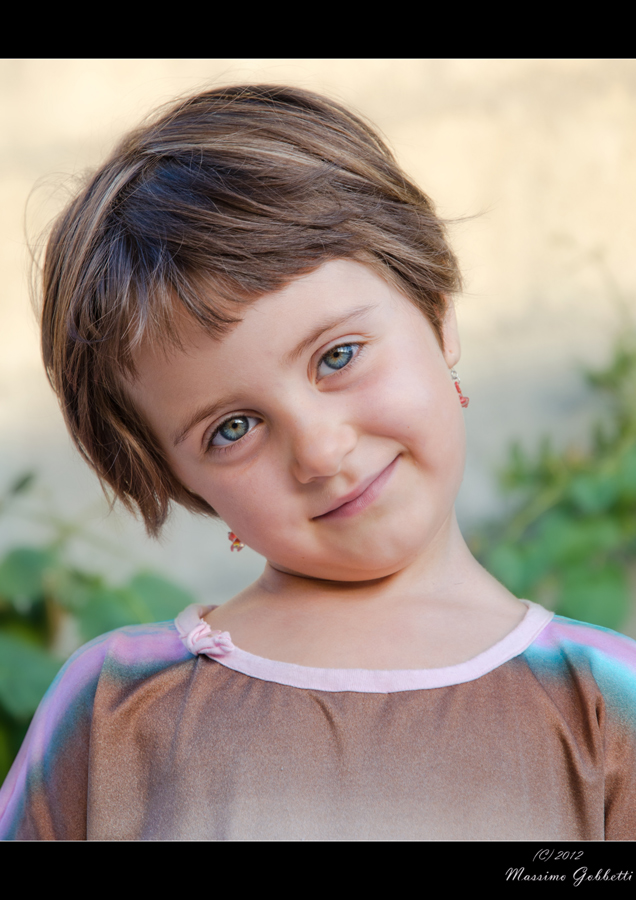Smile azzeccata la scelta di far inclinare la testa alla bambina, rende dinamica un'inquadratura molto frontale che altrimenti sarebbe risultata rigida. un ritratto sbarazzino e simpatico. concordo sul fatto che sia particolare e gradevole l'effetto che fa la maglietta sul bordo basso del frame. la luce è molto morbida e gestita bene.