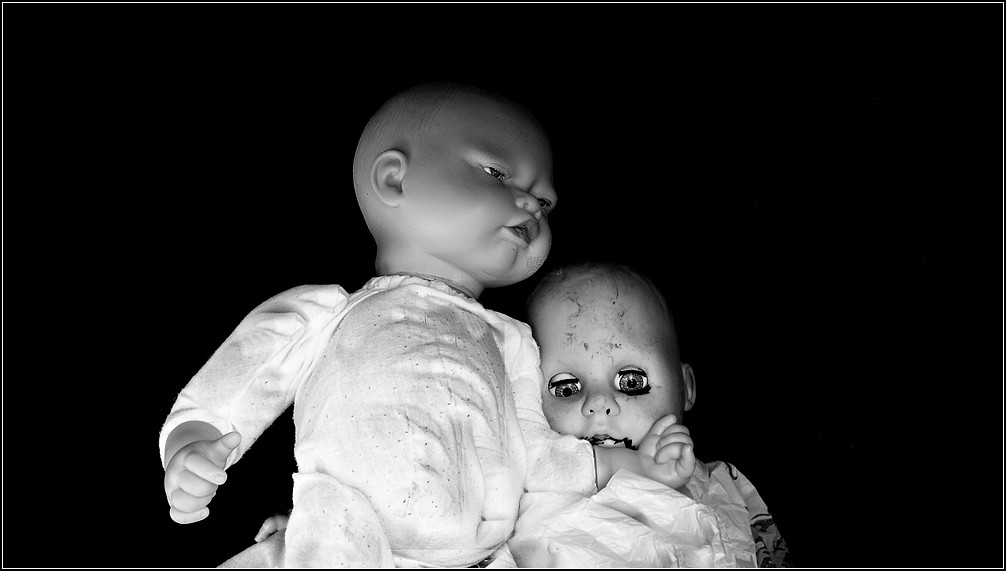 l'aria a destra e a sinistra delle bambole toglie molta suspence e vedrei meglio l'oggetto dello scatto immerso in un bleach-by-pass molto contrastato...ciò però significherebbe il...colore