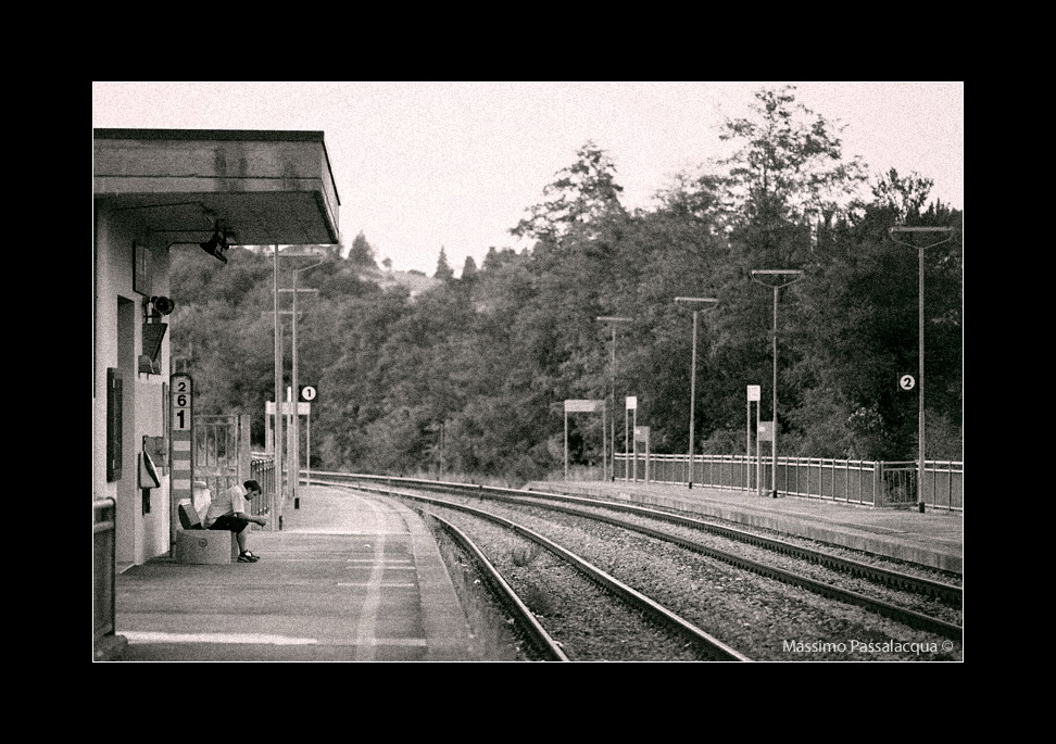 Un uomo seduto che aspetta il treno in una stazione desolata.