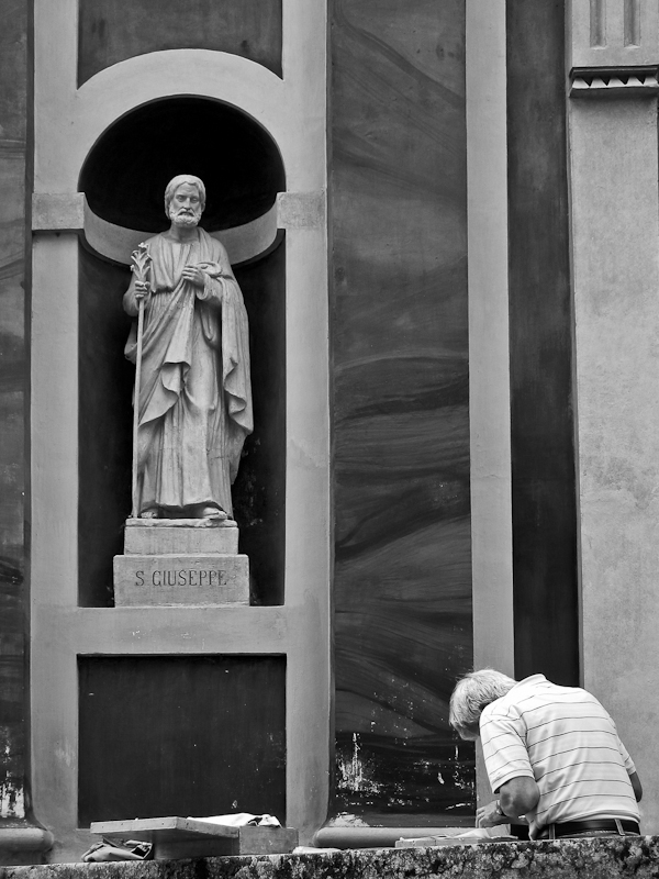 Ho voluto rappresentare non tanto cosa stia facendo l'uomo, ma il fatto che sembri inchinarsi al santo della statua.