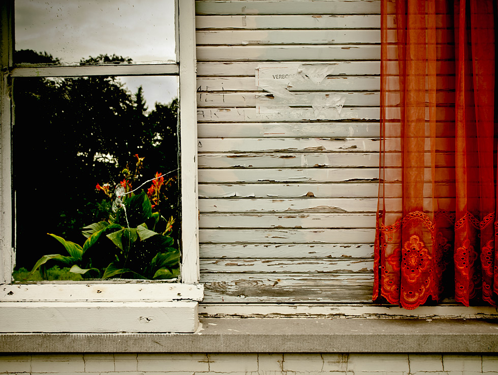Bella geometria sbilenca con una serie di piccoli particolari sui quali soffermare l'attenzione e rimanere così a passeggiare qua e là nel fotogramma: le screpolature della vernice, il vetro rotto, il ricamo sull'intensissimo rosso della tenda, il manifestino strappato... una perla quel rimando cromatico. Bella.