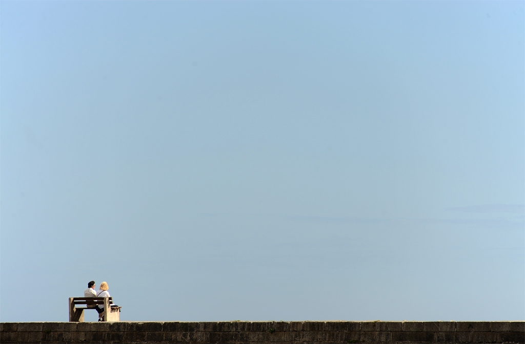 Di primo acchito avrei pensato di commentare che cosí tanto cielo era davvero troppo; poi, ripensandoci, mi viene da dire questa esasperazione dei rapporti spaziali nel fotogramma tra cielo e soggetto potrebbe essere l'unico modo per rendere originale lo scatto. Se fosse stato composto con la semplice regola dei terzi, sarebbe in effetti risultato molto banale. Bella la luce sui soggetti. Forse non é propriamente una street...Wink