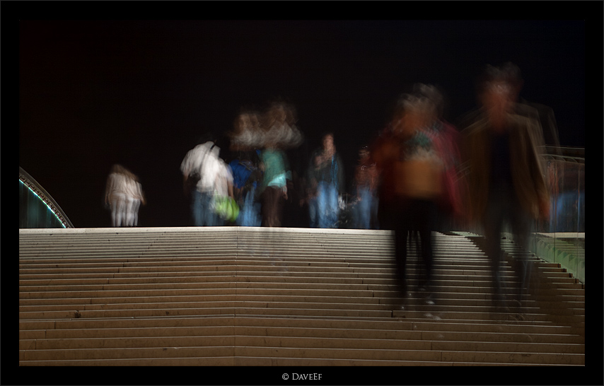 la forza della composizione sta nel dialogo tra la parte inferiore delle scalinate, a fuoco e geometrica, con l'evanescenza dei soggetti che sembrano fuochi fatui vaganti.