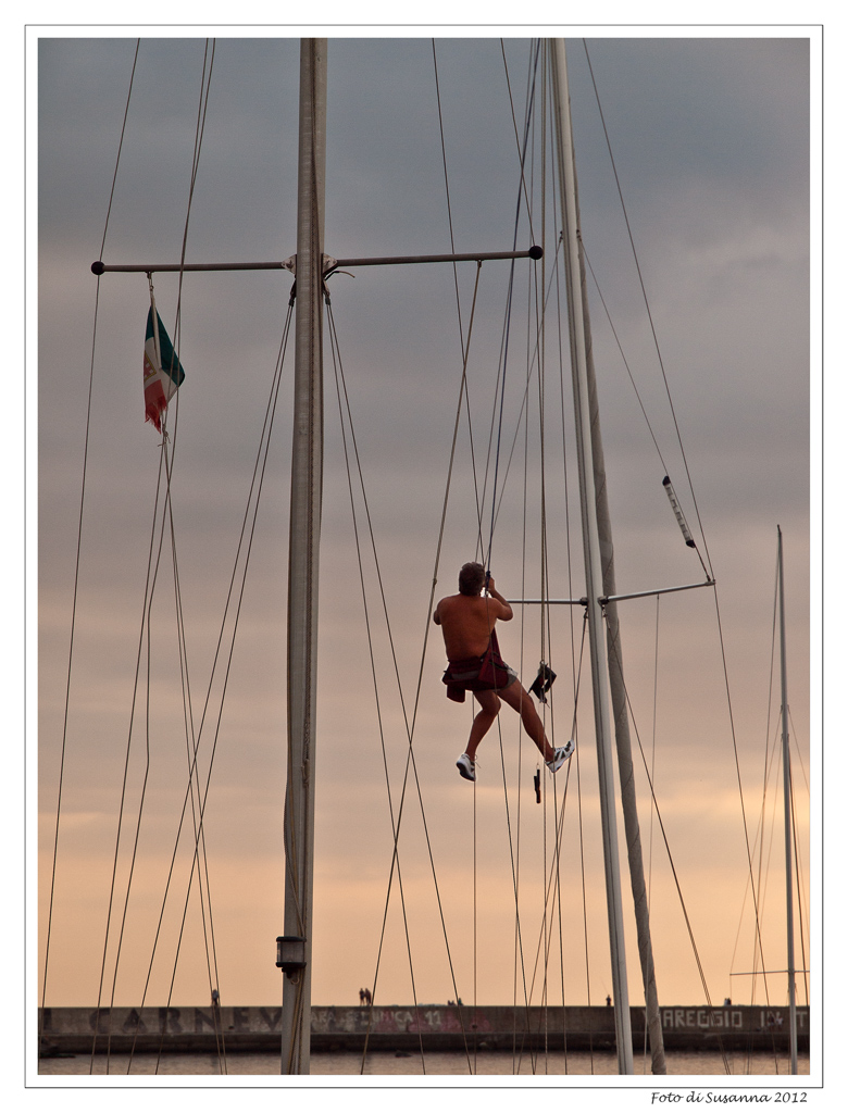 Scatto riuscito senz'altro, ben posizionato l'uomo all'interno del reticolo di linee, bilanciato dalla presenza della bandiera... tutto molto equilibrato. Attenzione nell'effettuare selezioni per trattare aree in maniera differenziata a non lasciare buchi come a me sembra qui sia accaduto tra braccio destro e testa.