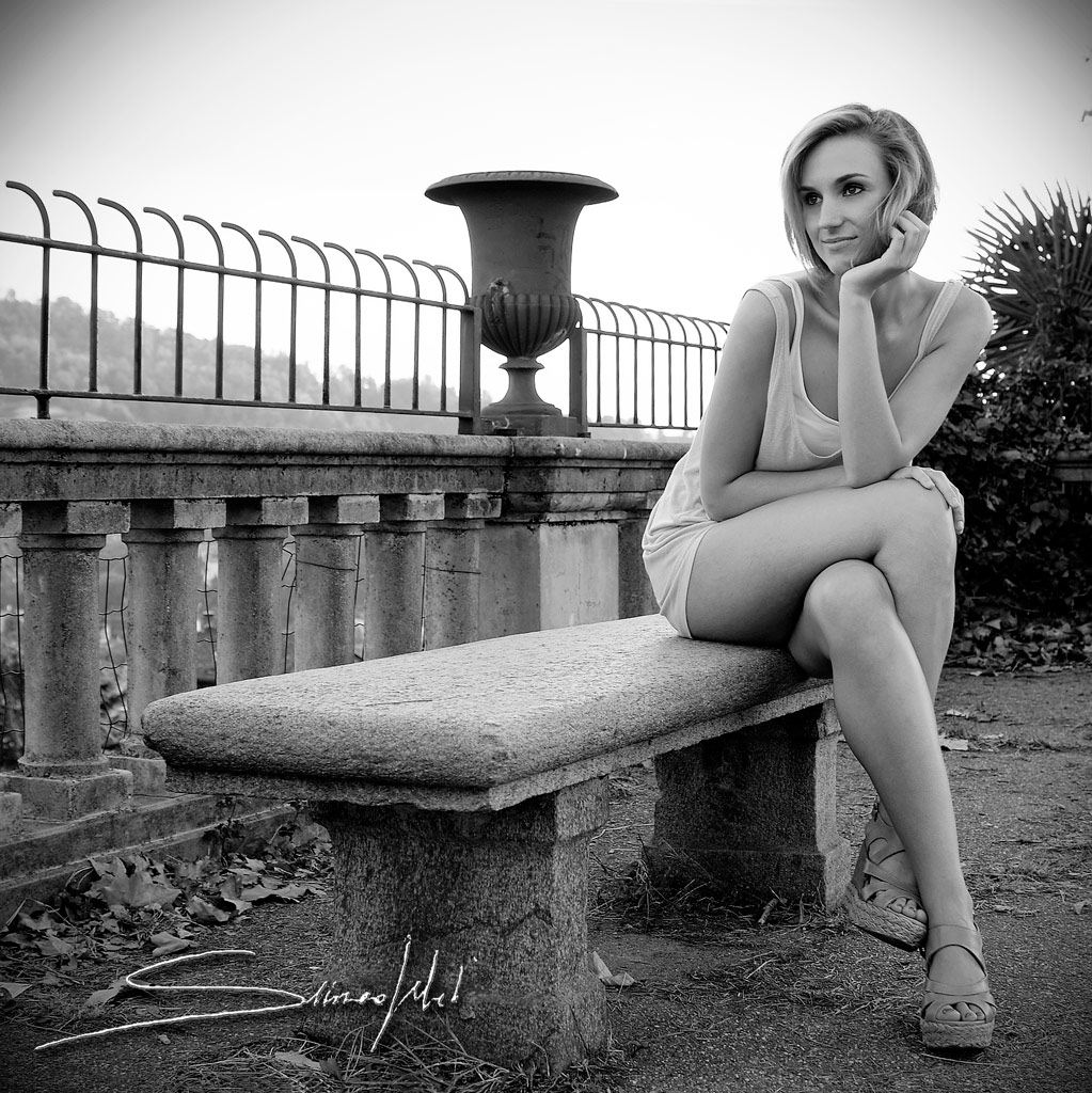 A me invece piace tutto: la composizione, con la ringhiera importante e il sedile in diagonale che conduce alla modella, correttamente inserita nel terzo